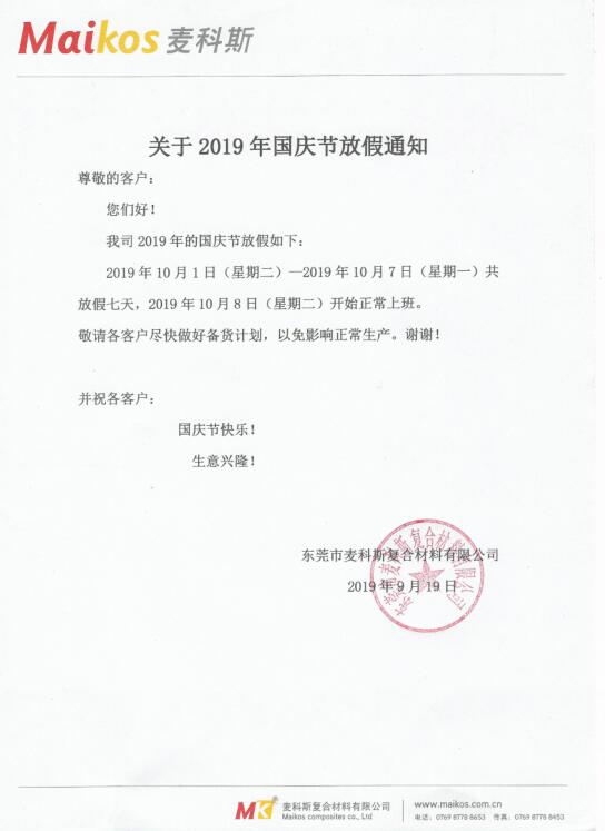 通知:国庆中秋双节我司放假时间为10.1~8日!期间只接单不发货,请客户们注意查看脱模剂库存,及时备货,确保生产。提前预祝大家节日快来!...